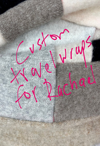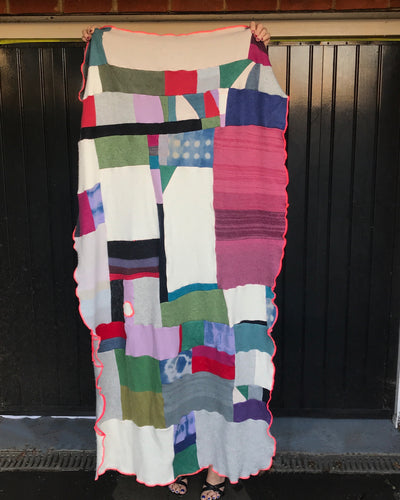I’m obsessed with the warmth and coziness of vintage cashmere. So I took my color and sense of composition and have started to create a collection of usable art pieces. These cashmere blankets are made of vintage cashmere and factory offcuts and are ore shrunk and dried before I assemble them together. I use an intuitive, improvisational method and add touches of color with neon thread that is used to combine them all together. Like traditional quilts, the beauty is in the imperfections. I send these off with a lavender sachet, 3 patches, and extra thread so that you can care for repair the pieces as they are warn and loved over the years.
