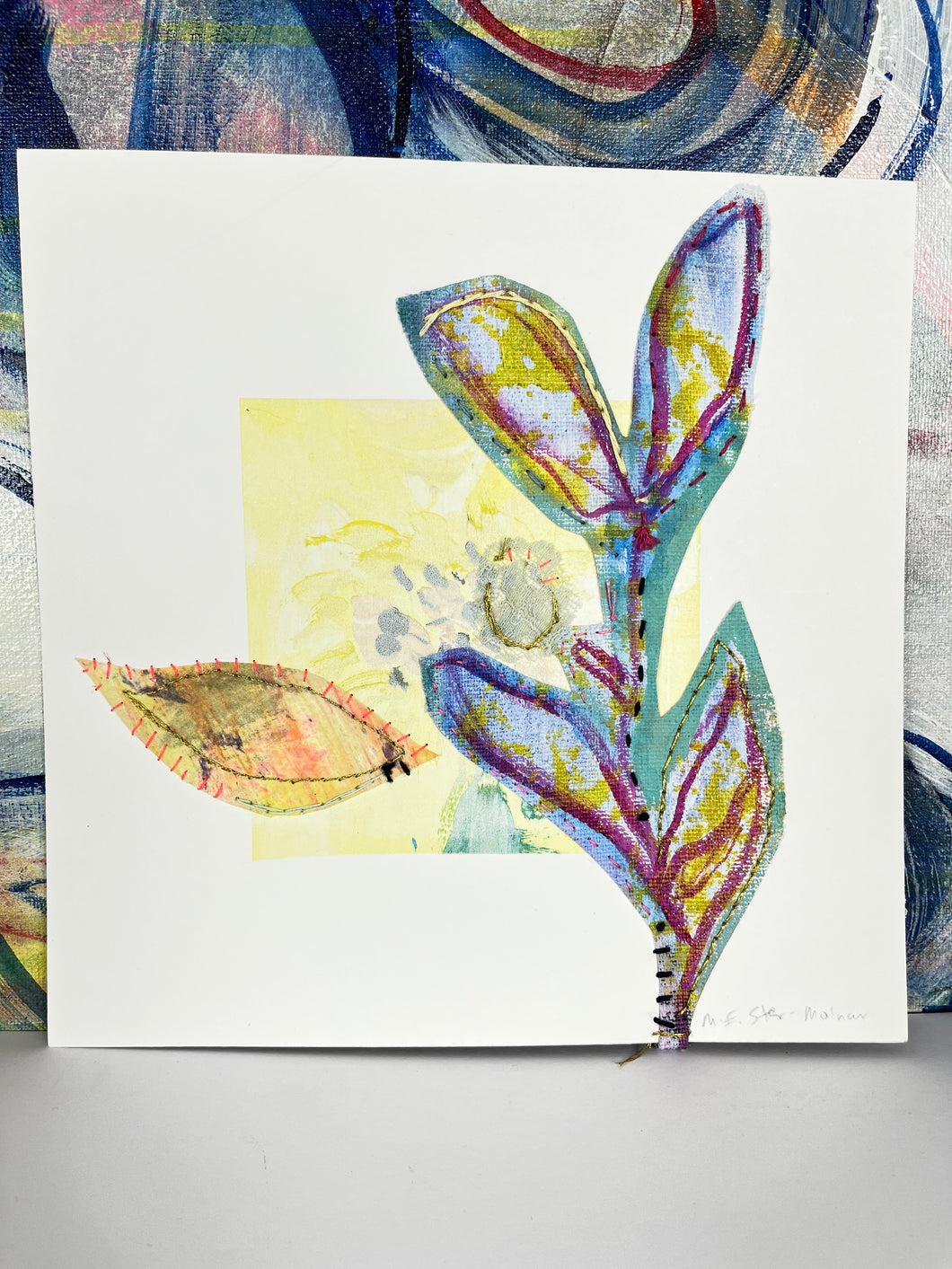 Each piece is an original, one of a kind hand painted monoprint that is then embellished with hand stitching. 300 gsm archival paper with touches of thread and textiles and sometimes even paper collage.