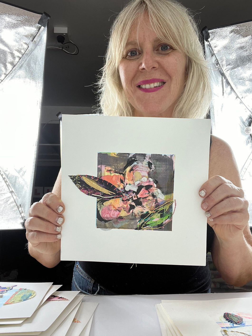 Each piece is an original, one of a kind hand painted monoprint that is then embellished with hand stitching. 300 gsm archival paper with touches of thread and textiles and sometimes even paper collage.