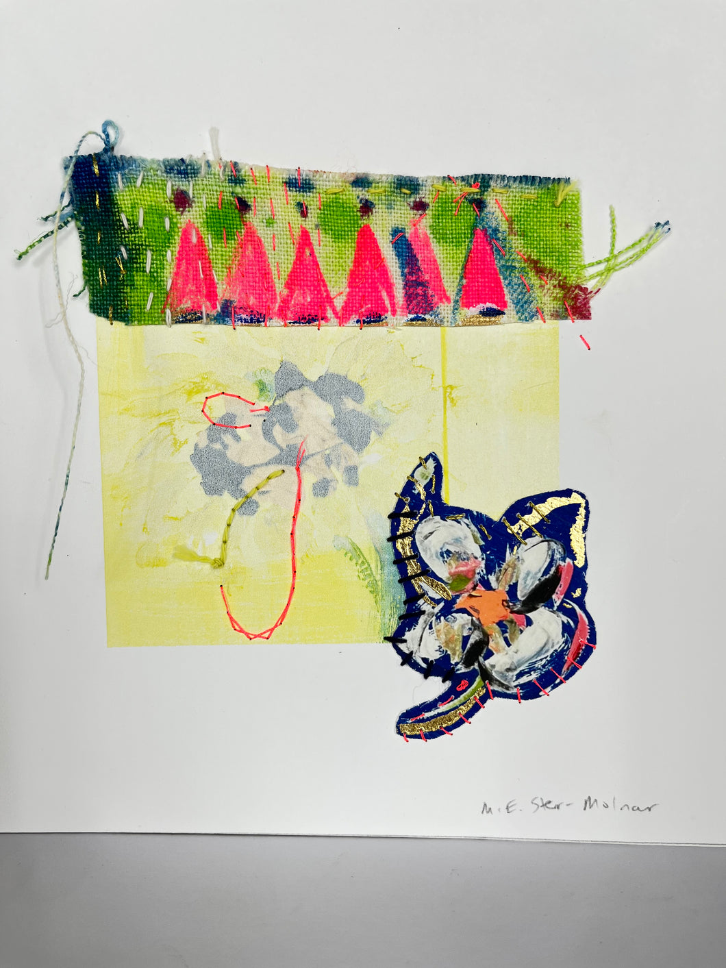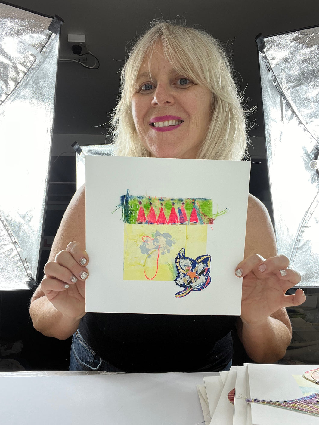 Each piece is an original, one of a kind hand painted monoprint that is then embellished with hand stitching. 300 gsm archival paper with touches of thread and textiles and sometimes even paper collage.