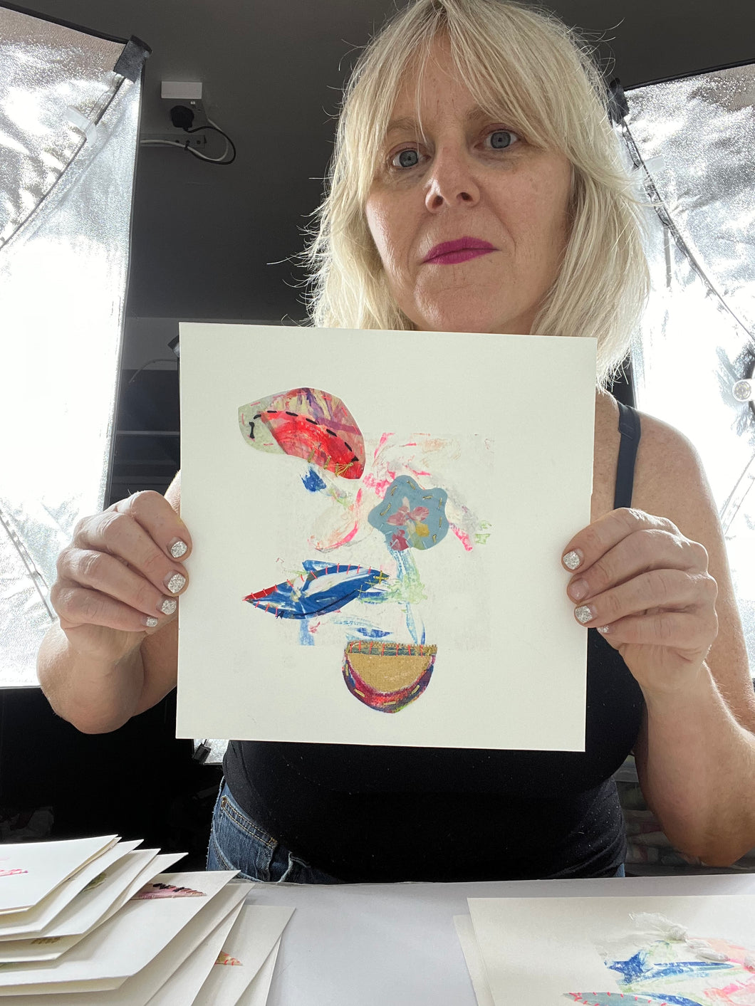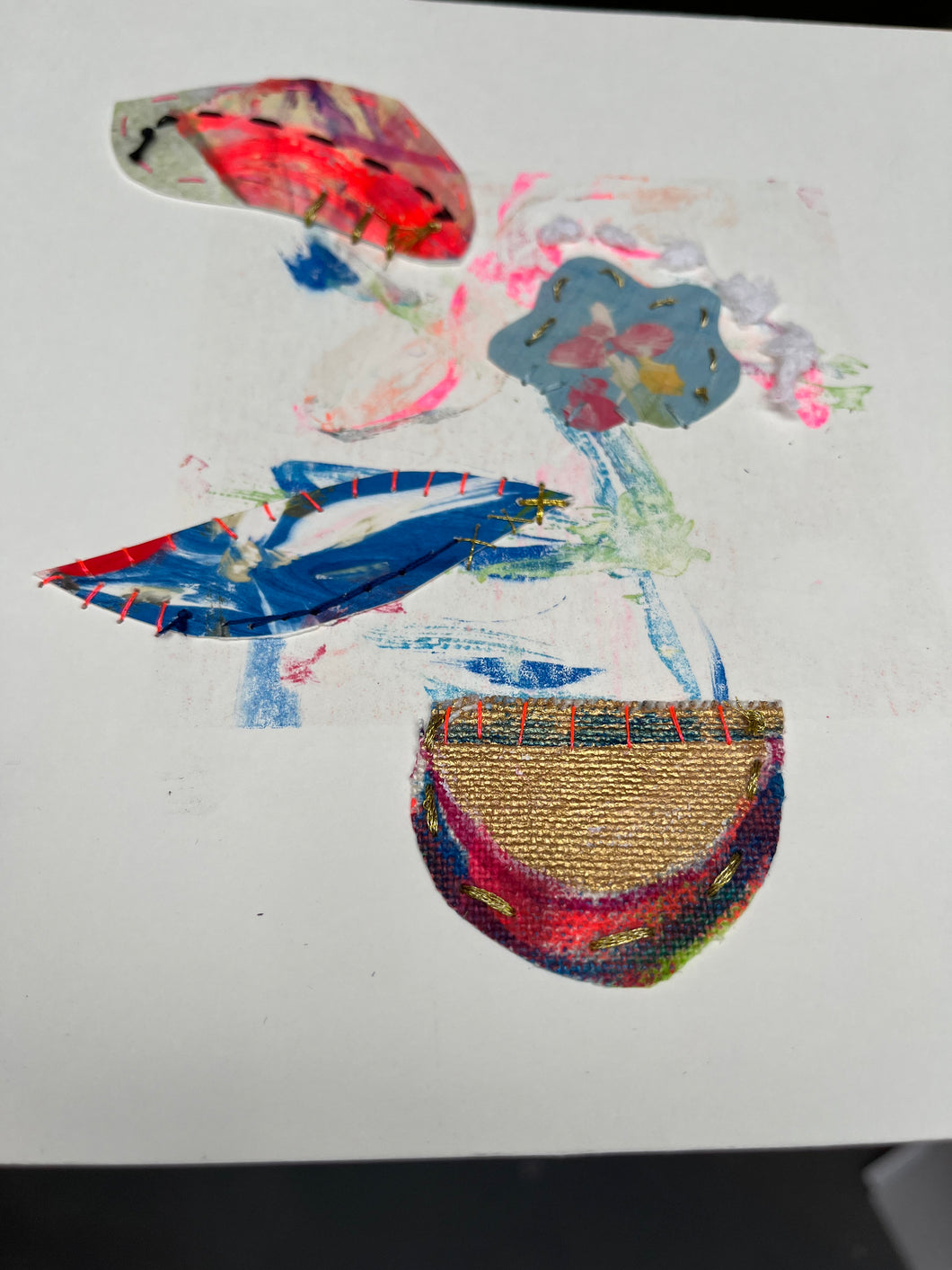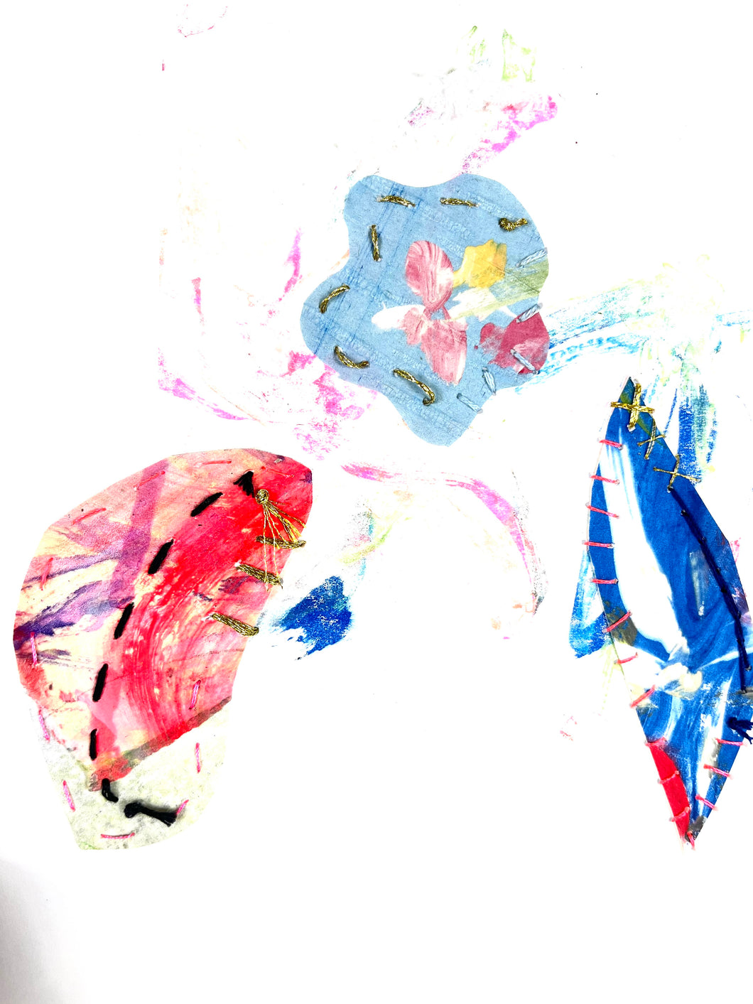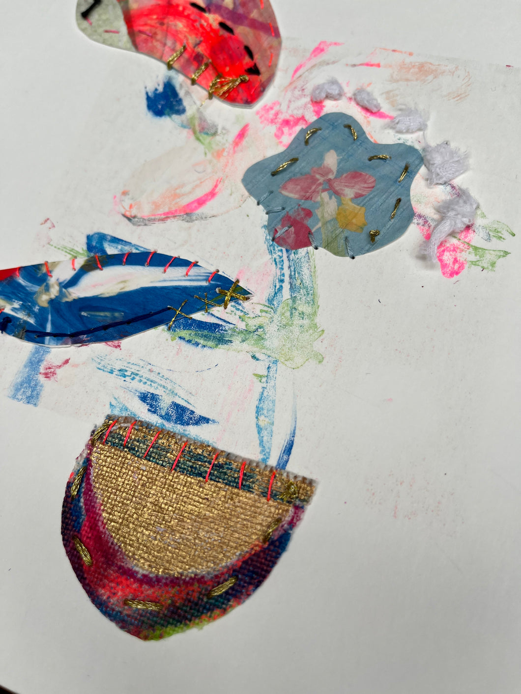 Each piece is an original, one of a kind hand painted monoprint that is then embellished with hand stitching. 300 gsm archival paper with touches of thread and textiles and sometimes even paper collage.
