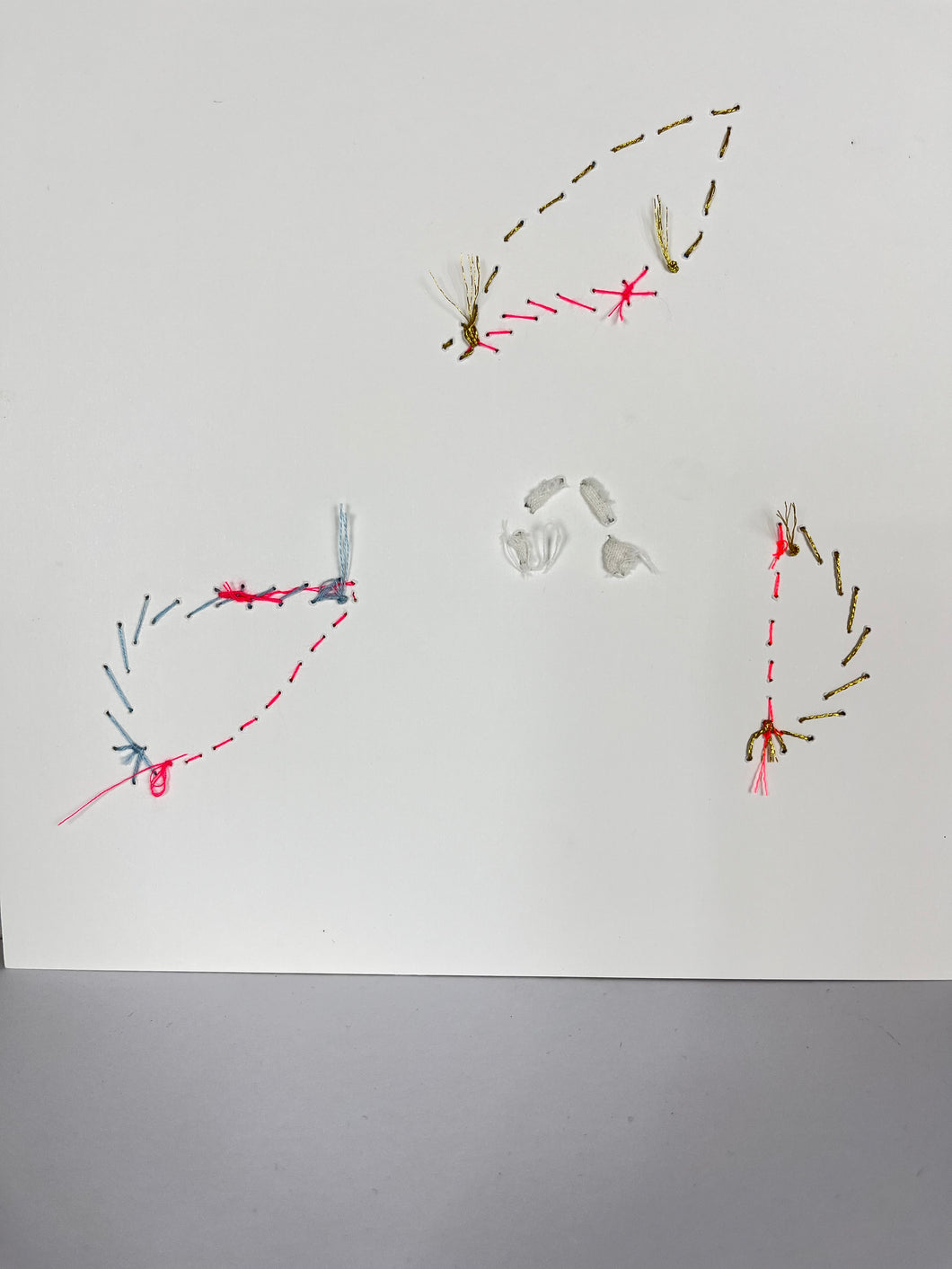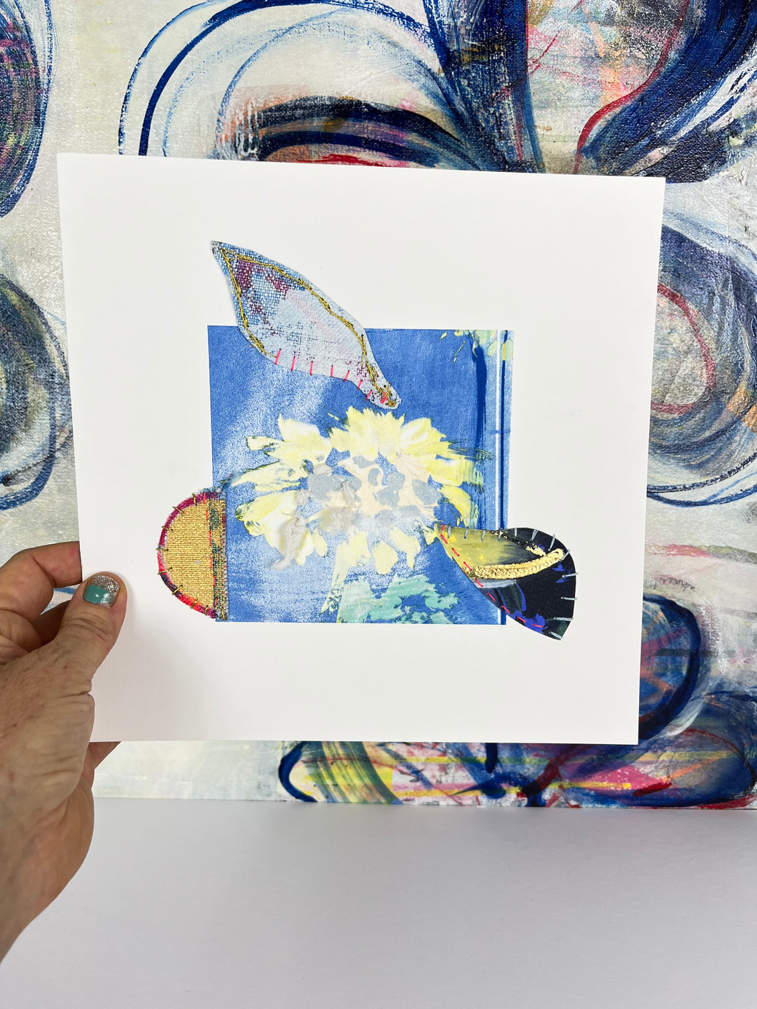 Each piece is an original, one of a kind hand painted monoprint that is then embellished with hand stitching. 300 gsm archival paper with touches of thread and textiles and sometimes even paper collage.
