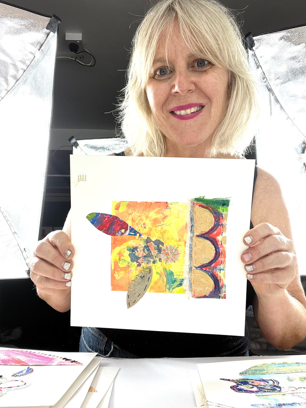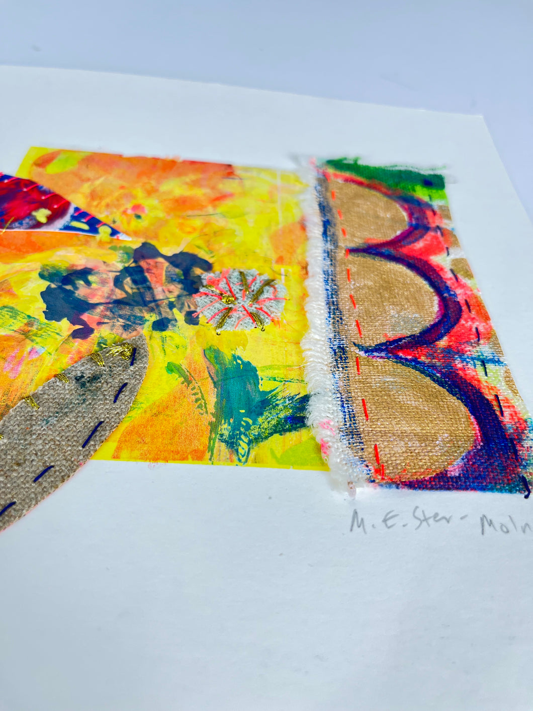 Each piece is an original, one of a kind hand painted monoprint that is then embellished with hand stitching. 300 gsm archival paper with touches of thread and textiles and sometimes even paper collage.