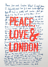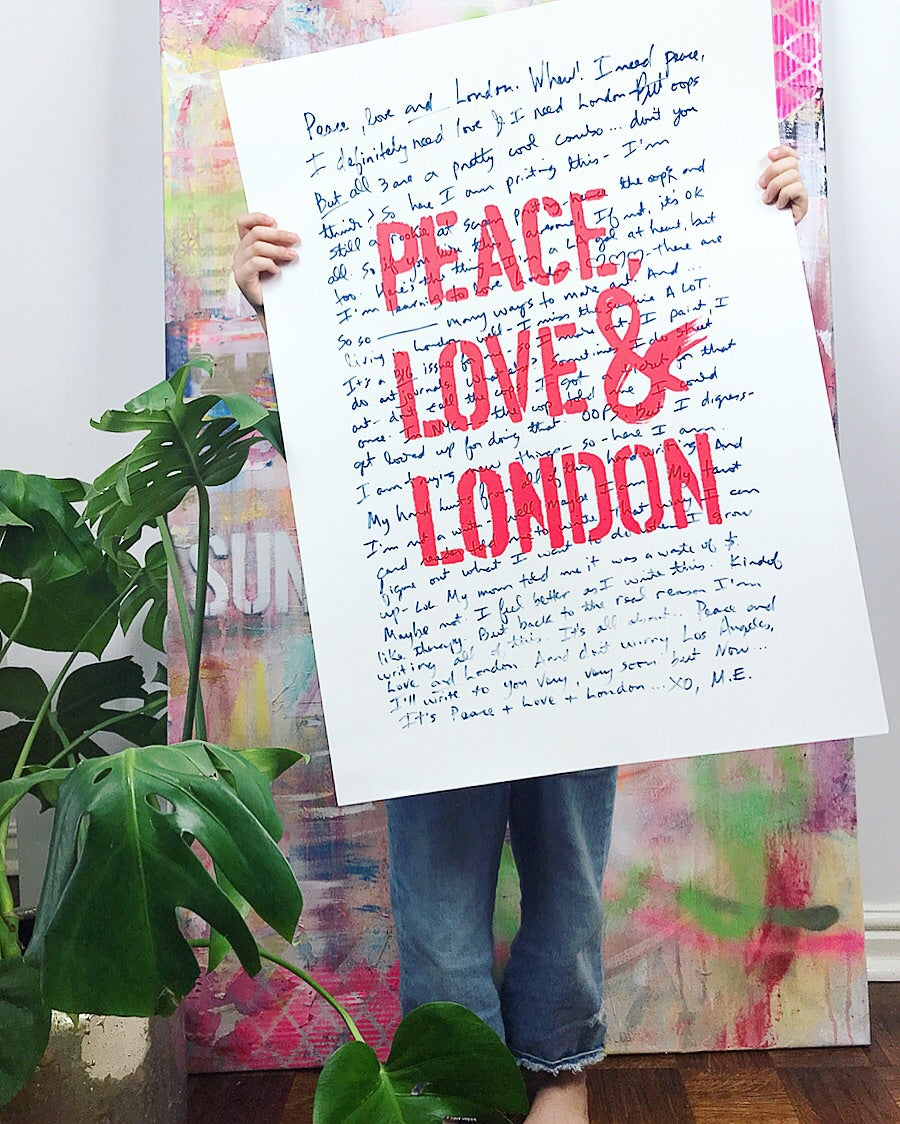 Peace, love and London. Whew! I need peace, I definitely need love & I need London. But oops But all 3 are a pretty cool combo...don’t you think? So here I am printing this - I’m still a rookie at screen printing - hence the oops and all. So if you like this - awesome! If not, it’s OK too. Here’s the thing - I am an LA gal at heart, but I’m learning to love London. There are so so ------ many ways to make art. And... living in London, well - I miss the sunshine A LOT. It’s a BIG issue for me - so I make art. I paint, I do art journals. What else? Sometimes I do street art - don’t tell the cops. I got a ticket for that once. In NYC --- the cop told me I could get locked up for doing that. OOPS. But I digress - I am trying new things - so - here I am. My hand hurts from all of this handwriting. And I’m not a writer - well, maybe I am. My tarot card reader told me to write. That way I can figure out what I want to do when I grow up - LOL. My mom told me it was a waste of $. Maybe not. I feel better as I write this. Kindof like therapy. But back to the real reason I’m writing all of this. It’s all about...Peace and Love and London. And don’t worry, Los Angeles, I’ll write to you very, very soon. but Now...It’s Peace + Love + London ... XO, M.E.